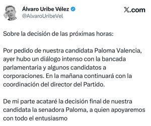 Uribe aseguró que respetará la determinación que adopte la candidata y reiteró su respaldo total al proceso interno del partido.