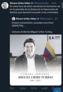 El expresidente Álvaro Uribe Vélez manifestó su inconformismo tras observar en transmisión televisiva la presencia del exmandatario Juan Manuel Santos en la cámara ardiente de Miguel Uribe Turbay.