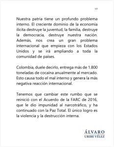 El líder del Centro Democrático también lanzó una fuerte crítica al presidente Gustavo Petro, al asegurar que “para los neocomunistas, el narcotráfico es una herramienta eficaz de destrucción de la democracia. Todo lo disfrazan en la búsqueda de la paz”.