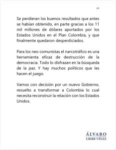 “Vamos por un nuevo gobierno, resuelto a transformar a Colombia, lo cual necesita reconstruir la relación con Estados Unidos”, afirmó Uribe, al señalar que el deterioro bilateral es consecuencia de la política exterior del actual Gobierno.