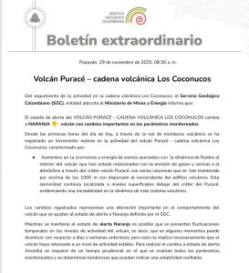 El Servicio Geológico Colombiano (SGC) elevó a alerta naranja el nivel del volcán Puracé, ubicado en el departamento del Cauca, tras registrarse una alteración significativa en su actividad desde las primeras horas de este viernes.