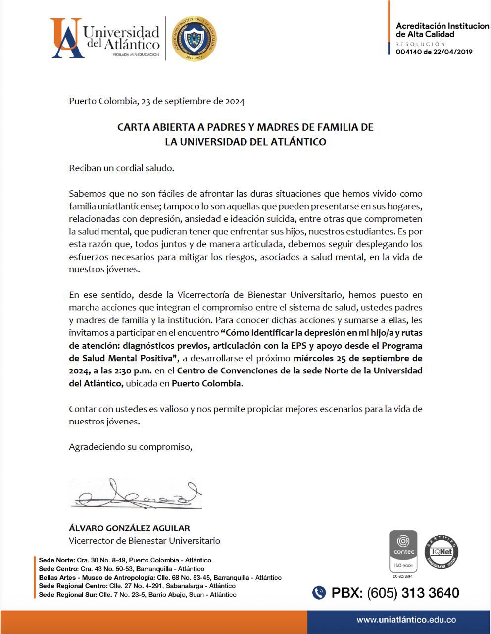 El Vicerrector de Bienestar Universitario de la Universidad del Atlántico, Álvaro González Aguilar, envió una carta abierta a los padres de familia de los estudiantes de la institución.