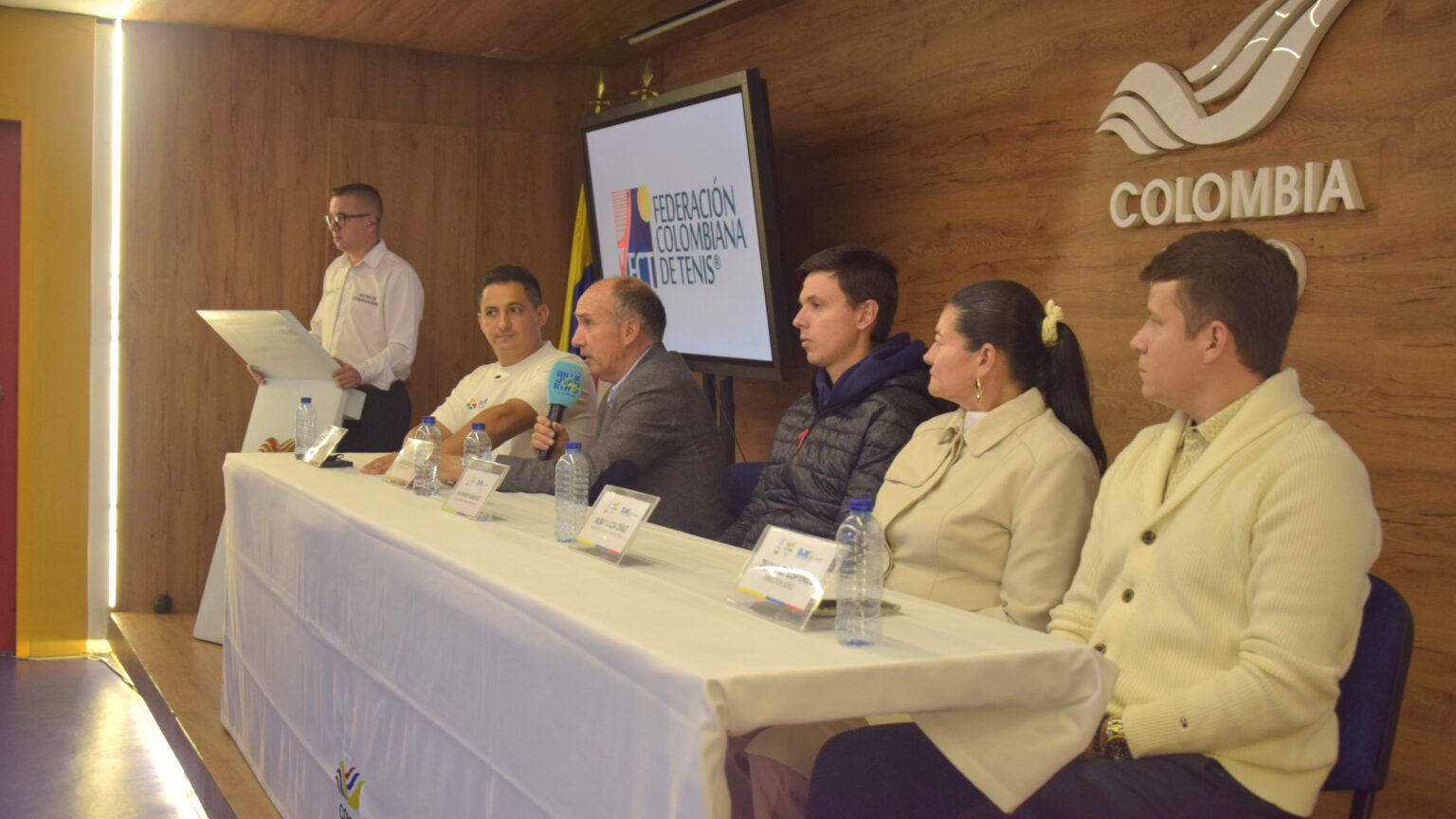 La mesa principal de la rueda de prensa contó con el capitán del equipo colombiano, Alejandro González; el director ejecutivo de la Federación Colombiana de Tenis, David Samudio; el director de la BJKC, Juan Espinel; la presidenta de la Liga de Tenis de Tolima, Alba Lucía Díaz; y el gerente del IMDRI, Felipe La Rota.