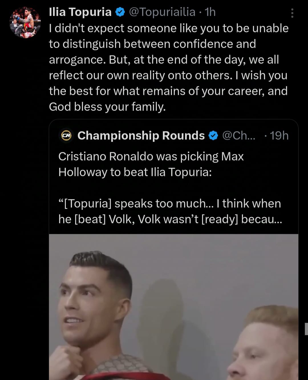 El luchador de UFC Ilia Topuria ha respondido a las recientes declaraciones de Cristiano Ronaldo, quien había criticado al hispanogeorgiano por su actitud antes del combate contra Max Holloway. En una charla previa al combate, Ronaldo expresó dudas sobre la calidad de Topuria y cuestionó su nivel al afirmar que “habla demasiado” y que “no ha peleado con los mejores”. Según el portugués, si Topuria logra vencer a Holloway, podría considerar respetarlo, pero anticipó la dificultad de que eso suceda dada la trayectoria invicta de su oponente en términos de nocaut.