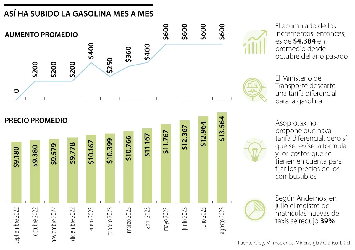 En enero el incremento fue de $400 en promedio y dejó el galón en $10.167 en promedio. Con aumentos que oscilaron entre $250 y $400 transcurrieron los meses hasta abril, pero a partir de mayo, el incremento ha sido constante de $600 en promedio, lo que puso un precio del galón de gasolina de $13.564 en agosto. Se esperan más aumentos.