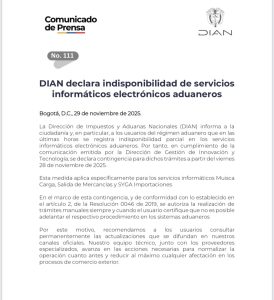 La DIAN (@DIANColombia) anunció que, desde el 28 de noviembre, varios de sus servicios informáticos aduaneros presentan fallas técnicas, afectando directamente los trámites en Muisca Carga S.A.S., Salida de Mercancías y SYGA Importaciones.