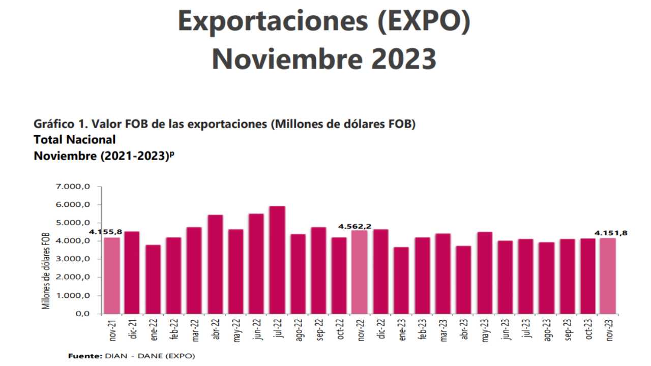 El Departamento Administrativo Nacional de Estadística (DANE) y la Dirección de Impuestos y Aduanas Nacionales (DIAN) informaron que las exportaciones colombianas experimentaron una reducción del 9% en noviembre de 2023 en comparación con el mismo mes del año anterior. Un ingreso de USD 4.1 millones FOB, correspondiente a transacciones marítimas o fluviales, reflejó esta disminución.
