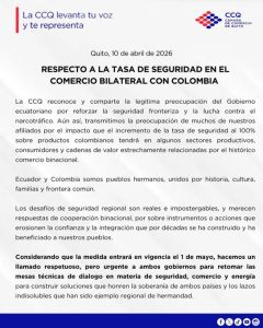 El Comité Empresarial Ecuatoriano también se sumó al llamado y advirtió que el incremento de la llamada “tasa de seguridad” podría tener efectos negativos en el ya reducido comercio bilateral y en la estabilidad de la Comunidad Andina.
