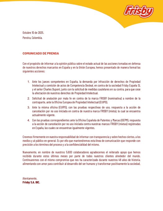 Frisby España no se ha pronunciado públicamente sobre la demanda. Por su parte, la empresa colombiana reiteró que continuará “haciendo valer sus derechos” ante las instancias internacionales correspondientes.