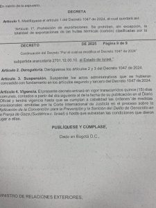 La decisión surge en el marco del rompimiento de relaciones diplomáticas anunciado por el presidente Gustavo Petro, y se enmarca en las crecientes tensiones políticas entre ambos países. El documento, que está siendo evaluado por distintos sectores económicos y sociales, contempla la restricción inmediata y absoluta de la venta de carbón colombiano al país del Medio Oriente, uno de los destinos habituales de este recurso natural.
