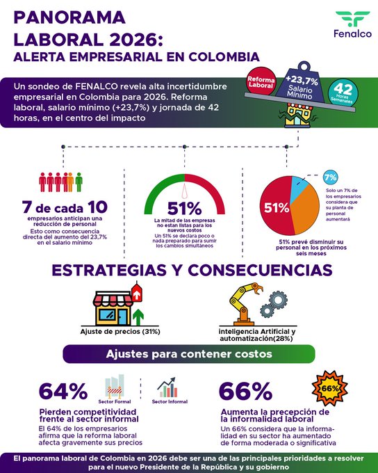Un reciente sondeo de FENALCO revela un escenario crítico para el empleo formal y la competitividad empresarial en Colombia durante 2026, en medio del aumento del salario mínimo en 23,7 %, la reforma laboral y la reducción de la jornada a 42 horas semanales.