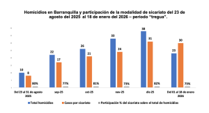 Desde la firma de la tregua, se han registrado 152 homicidios en Barranquilla, de los cuales 120 corresponden a sicariato y ajustes de cuentas entre bandas, es decir, un 79 % del total. Entre septiembre y diciembre de 2025, los homicidios crecieron de 22 a 38 casos mensuales, manteniendo altos porcentajes de asesinatos por sicariato. Solo del 1 al 19 de enero de 2026 se han reportado 30 homicidios.