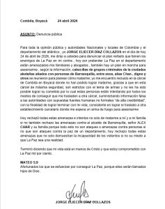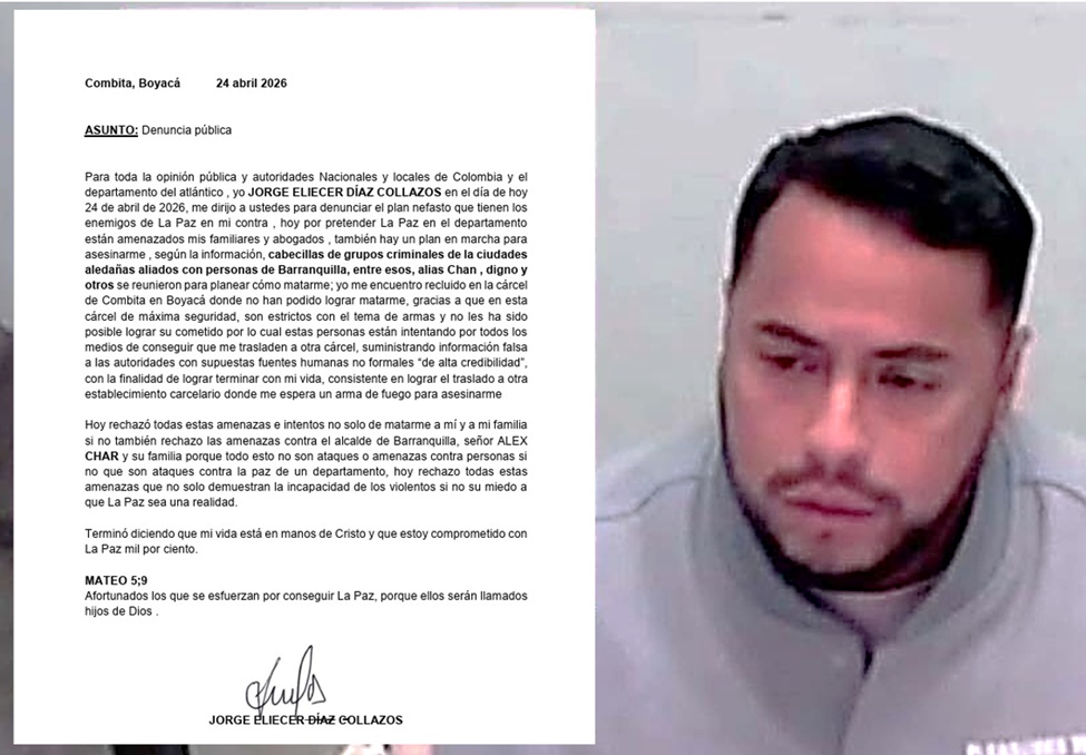 Díaz Collazos insiste en que, desde su reclusión, ha pretendido impulsar la paz en el departamento del Atlántico, una postura que, según él, ha puesto en riesgo tanto a sus abogados como a su núcleo familiar. Por ahora, las autoridades no han emitido una respuesta oficial sobre la veracidad de la información contenida en la misiva o sobre si se tomarán medidas adicionales en el esquema de custodia del detenido.