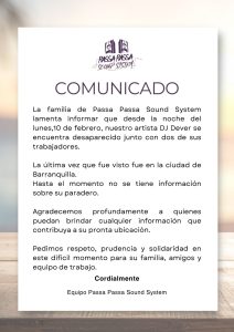 “La familia de Passa Passa Sound System lamenta informar que desde la noche del lunes, nuestro artista DJ Dever se encuentra desaparecido junto con dos de sus trabajadores”, señala el pronunciamiento.