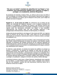 “La solicitud la recibí por parte del comisionado de Paz, Otty Patiño. Vamos a firmar con el único fin de sostener la tregua de paz entre las bandas y, principalmente, proteger a la ciudadanía”, afirmó el ministro, quien además aseguró que los traslados se realizarán bajo estrictas medidas de seguridad y vigilancia del Inpec.