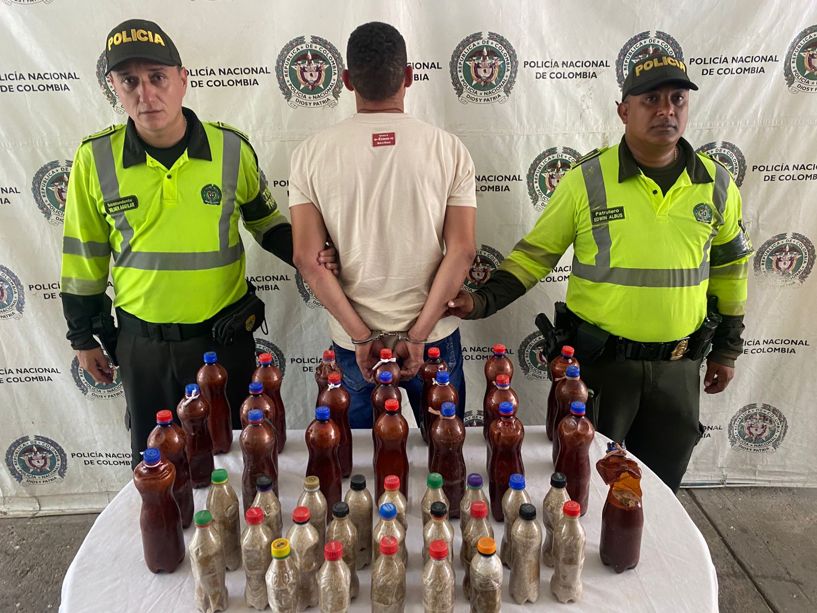 En total, fueron encontradas 23 botellas plásticas de un litro y 23 botellas de 350 mililitros que contenían base de cocaína, con un peso aproximado de 37 kilogramos, avaluados en cerca de 98 millones de pesos.