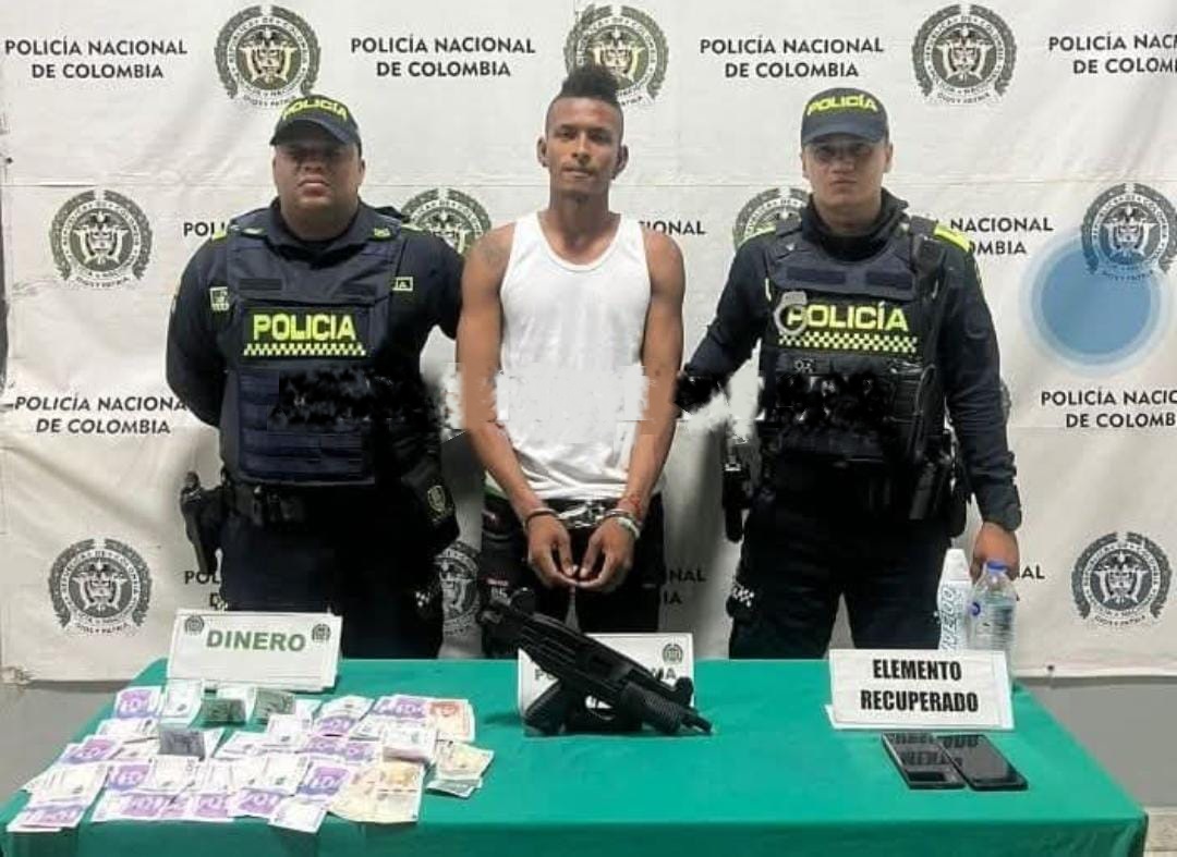 De acuerdo con el informe policial, los agentes fueron alertados por un ciudadano que pidió auxilio al haber sido intimidado con un arma de fuego para ser despojado de sus pertenencias. De inmediato se inició una persecución que permitió interceptar al sospechoso sobre la carrera 41 con calle 10.Durante el registro personal, los uniformados hallaron en su poder un arma de fuego tipo Mini Uzi, calibre 9 mm, dos teléfonos celulares y dos millones de pesos en efectivo, presuntamente producto del robo.El capturado fue puesto a disposición de la Fiscalía General de la Nación por los delitos de hurto agravado y porte ilegal de armas de fuego, accesorios o municiones.El brigadier general Edwin Masleider Urrego Pedraza