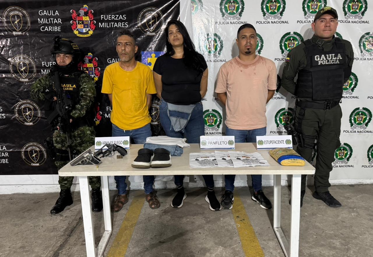 Durante el operativo, fueron capturados en flagrancia tres individuos identificados por sus alias: ‘Carlos’, ‘Jaz’ y ‘Negro’. Los detenidos cuentan con antecedentes judiciales por delitos como tráfico y fabricación de estupefacientes, así como porte y fabricación de armas de fuego. La intervención policial resultó en la incautación de un arma de fuego tipo pistola con un cartucho, un arma traumática tipo revólver modificada, cuatro cartuchos calibre 38 milímetros, tres panfletos extorsivos, quinientos gramos de marihuana y prendas de vestir presuntamente utilizadas para cometer las extorsiones, lo cual fue corroborado mediante registros fílmicos.