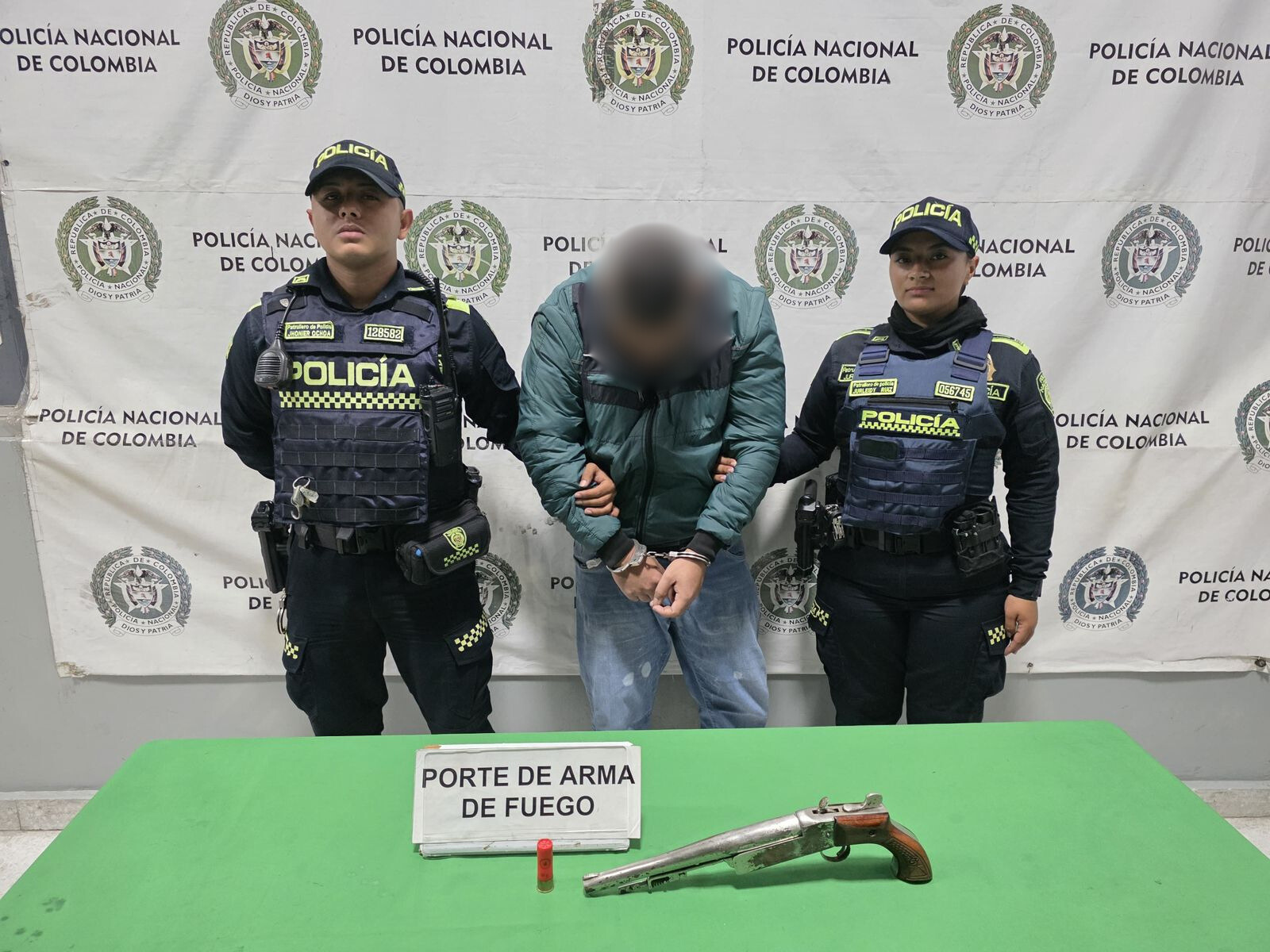 El procedimiento fue realizado por uniformados de la Estación de Policía San José, quienes, en medio de labores de patrullaje preventivo, observaron a un individuo que mostró una actitud sospechosa al notar la presencia policial. Tras practicarle un registro a persona, las autoridades hallaron en su poder un arma de fuego tipo escopeta, calibre 16, de fabricación industrial.