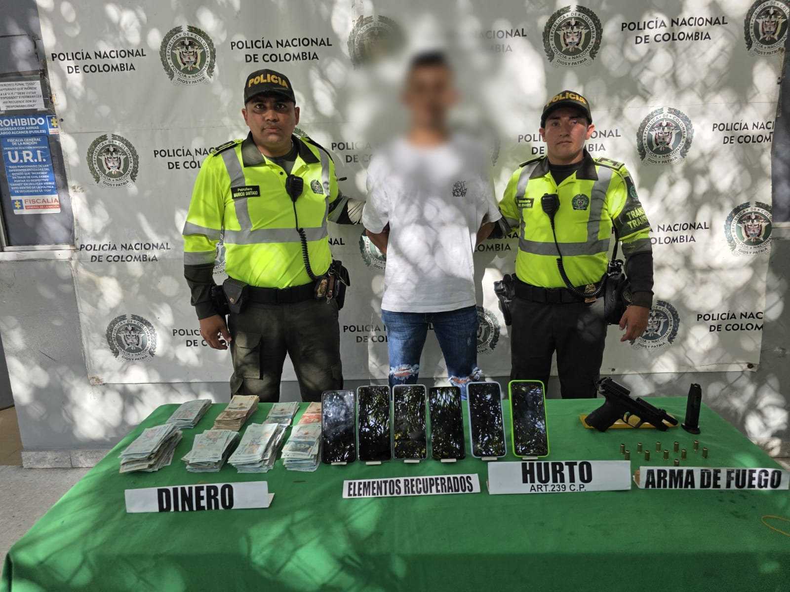 Asimismo, la Policía confirmó la recuperación de seis teléfonos celulares y dinero en efectivo, con un valor estimado cercano a los 14 millones de pesos, elementos que corresponderían a lo hurtado durante el asalto y que fueron devueltos a sus propietarios tras la verificación correspondiente.
