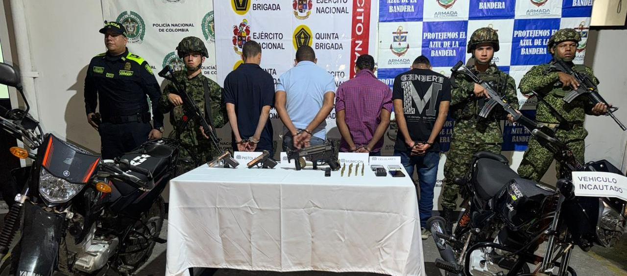 Las detenciones se realizaron en flagrancia en el corregimiento de Badillo, donde las autoridades lograron incautar tres armas de fuego, munición de diferentes calibres, equipos de comunicación móvil y dos vehículos que serían utilizados para actividades ilícitas.
