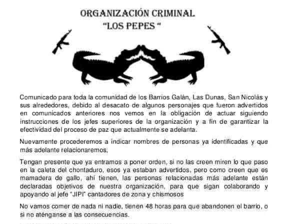 “Estos panfletos demuestran que el conflicto entre las bandas continúa activo y en expansión. Además, no se puede reducir este fenómeno solo a ‘Los Pepes’ y ‘Los Costeños’, porque hay otros actores involucrados y las autoridades deben actuar de manera integral”, afirmó García Medrano.