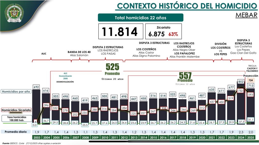 Durante la tregua, además, Barranquilla fue escenario de dos masacres que estremecieron a la ciudad. La primera ocurrió el 1 de octubre de 2025 en una barbería del corregimiento de Juan Mina, donde tres jóvenes fueron asesinados. La segunda se registró el 12 de noviembre en Villas de la Cordialidad, con un saldo de tres muertos y dos heridos, en un ataque que las autoridades asociaron a disputas por el control del microtráfico entre ‘Pepes’ y ‘Costeños’.   En el balance anual de 2025, Barranquilla cerró con 428 homicidios, una reducción del 13 % frente a 2024. No obstante, el 80 % de los asesinatos estuvo relacionado con disputas entre organizaciones criminales como ‘Los Costeños’, ‘Los Pepes’ y el ‘Clan del Golfo’, y el sicariato siguió concentrando la mayoría de los casos.   Desde la administración distrital se subraya que estos resultados no obedecen a recursos del Gobierno nacional, sino a inversiones locales derivadas del impuesto de seguridad, que aportó 78.000 millones de pesos para fortalecimiento de la Fuerza Pública, tecnología, movilidad policial e infraestructura de CAI.