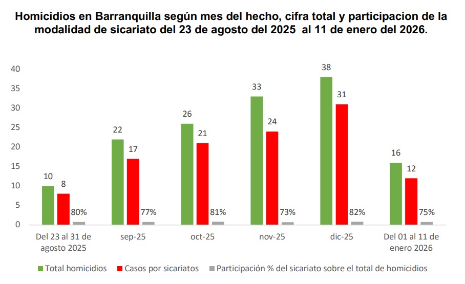 Las estadísticas oficiales de la Policía Metropolitana y de la Alcaldía de Barranquilla ponen en entredicho la efectividad de la llamada “tregua” entre las estructuras criminales ‘Los Costeños’ y ‘Los Pepes’, promovida en el marco de los diálogos impulsados por el Gobierno nacional. Desde el inicio de ese acuerdo, el 23 de agosto de 2025, se han registrado 145 homicidios en la ciudad, de los cuales 113 fueron cometidos bajo la modalidad de sicariato, lo que representa el 78 % del total.   El debate se intensificó luego de que el presidente Gustavo Petro asegurara que su gobierno logró reducir a la mitad los homicidios en Barranquilla gracias a un proceso de paz entre bandas criminales. Sin embargo, los datos oficiales muestran un comportamiento contrario: mes a mes, los asesinatos aumentaron durante el periodo de vigencia de la tregua.   Entre el 23 y el 31 de agosto de 2025 se contabilizaron 10 homicidios, ocho de ellos por sicariato. En septiembre se reportaron 22 casos, en octubre 29, en noviembre 30 y en diciembre la cifra ascendió a 38 homicidios, manteniéndose el sicariato entre el 73 % y el 82 % de los hechos violentos. En los primeros once días de enero de 2026 ya se registraban 16 asesinatos, 12 de ellos ejecutados por encargo.   Las propias autoridades locales concluyen que no se evidencia una reducción significativa ni sostenida del homicidio, especialmente del sicariato, modalidad que continúa siendo el principal mecanismo de ajuste de cuentas entre estructuras criminales, pese al anuncio del acuerdo, que vence el próximo 20 de enero.