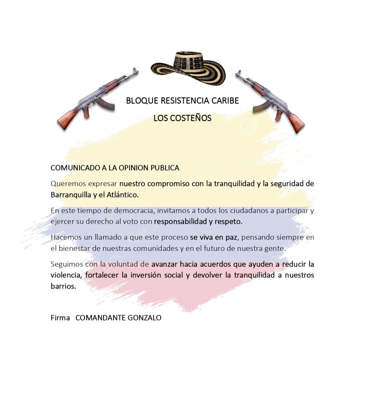 El grupo de delincuencia común conocido como “Los Costeños” emitió un mensaje de tranquilidad para los ciudadanos del departamento del Atlántico, asegurando que respetarán el desarrollo de las elecciones programadas para el próximo domingo.