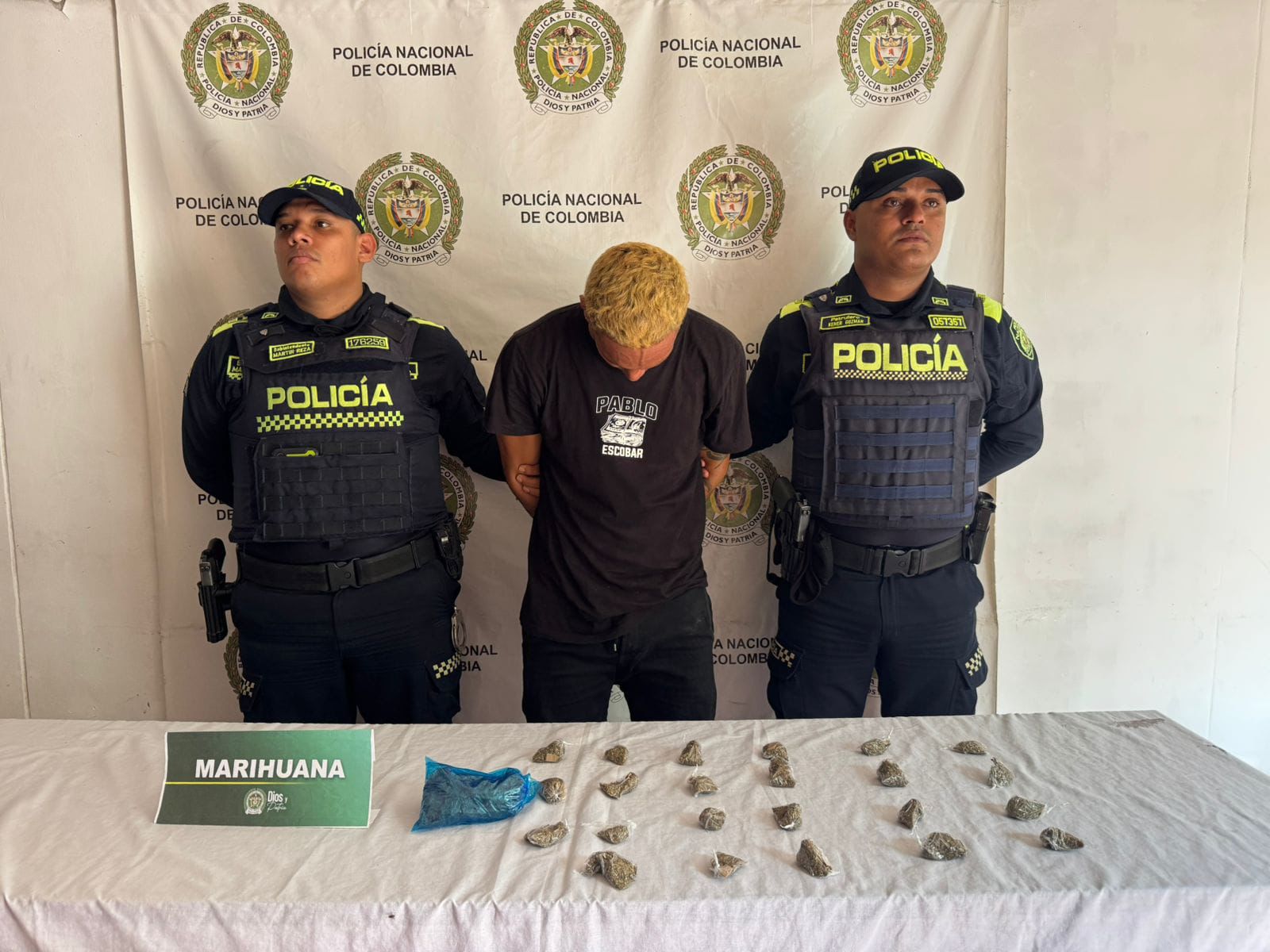 El procedimiento se adelantó en el barrio Centro, donde uniformados de la Estación de Policía realizaban labores de vigilancia cuando notaron el comportamiento sospechoso de un ciudadano que se movilizaba por la zona. Al practicarle un registro personal, los policías le encontraron 142 gramos de una sustancia vegetal que, por sus características, correspondería a marihuana.