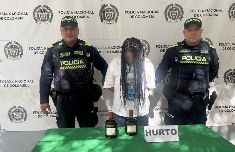 De manera inmediata, se activó el protocolo de reacción y, con apoyo de la zona de atención, se logró ubicar a la señalada. Al practicarle un registro, se le hallaron en su poder dos botellas de whisky, las cuales fueron reconocidas por la víctima como propiedad del establecimiento afectado.
