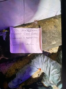 Según versiones preliminares, los sicarios dejaron un letrero junto a los cuerpos, en el que se atribuyen el ataque en nombre de una presunta estructura armada ilegal y advierten que “las muertes continuarán”, aumentando la alarma entre los habitantes.