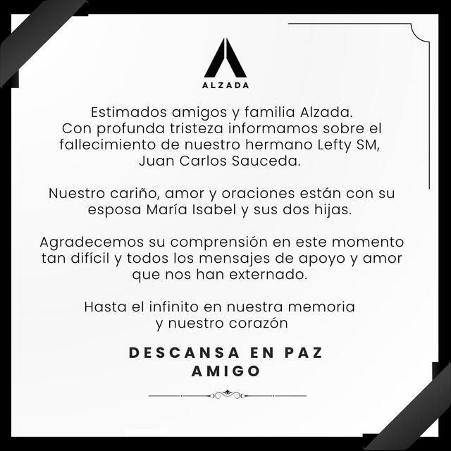 “Estimados amigos y familia Alzada. Con profunda tristeza informamos sobre el fallecimiento de nuestro hermano Lefty SM, Juan Carlos Sauceda. Nuestro cariño, amor y oraciones están con su esposa María Isabel y sus dos hijas. Agradecemos su comprensión en este momento tan difícil y todos los mensajes de apoyo y amor que nos han externado. Hasta el infinito en nuestra memoria y nuestro corazón”, confirmó el sello discográfico Alzada Récord en sus redes sociales.