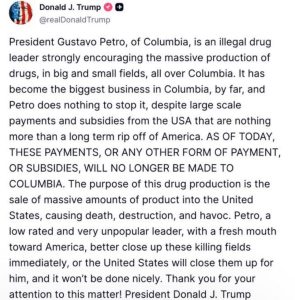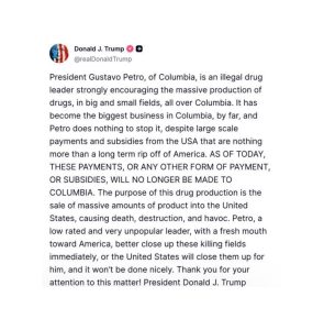 “A partir de hoy, estos pagos, o cualquier otra forma de ayuda o subsidios, ya no serán entregados a Colombia. El propósito de esta producción de drogas es la venta masiva del producto hacia Estados Unidos, causando muerte, destrucción y caos. Petro, un líder impopular y de baja calificación, debería cerrar inmediatamente esos campos de muerte, o Estados Unidos los cerrará por él, y no será de una forma amable”.
