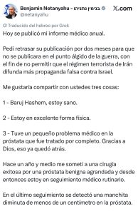 El primer ministro de Israel, Benjamín Netanyahu, informó que se sometió de manera discreta a un tratamiento médico tras ser diagnosticado con cáncer de próstata, luego de un examen de rutina.