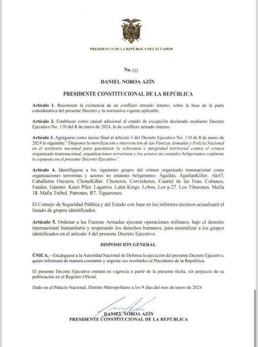 Por el momento, la transmisión en vivo continúa, pero las luces del set están apagadas y solo hay música de fondo. El presidente de Ecuador, Daniel Noboa Azín, firma un decreto ejecutivo que declara un conflicto armado interno y designa a varias organizaciones como terroristas, ordenando operaciones militares contra ellas.