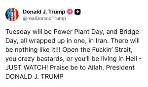 “El martes será el día de la central eléctrica y el día del puente, todo en uno, en Irán. ¡No habrá nada igual! ¡Abran el maldito estrecho… o vivirán el infierno!”, expresó el mandatario, en declaraciones que han generado preocupación en la comunidad internacional.
