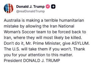 El presidente de Estados Unidos, Donald Trump, instó al Gobierno de Australia a considerar la concesión de asilo al equipo femenino de fútbol de Irán, luego de que las jugadoras se negaran a cantar el himno nacional antes de un partido de la Copa de Asia.