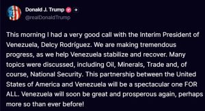 Rodríguez describió el miércoles como “productiva y cortés” la “larga” llamada que sostuvo con su par estadounidense Donald Trump, que antes la calificó como una “persona formidable”. “Sostuve una larga, productiva y cortés conversación telefónica con el presidente de los Estados Unidos, Donald Trump, desarrollada en un marco de respeto mutuo”, escribió Rodríguez en su cuenta en Telegram. “Abordamos una agenda de trabajo bilateral en beneficio de nuestros pueblos, así como de asuntos pendientes en la relación entre nuestros gobiernos”.