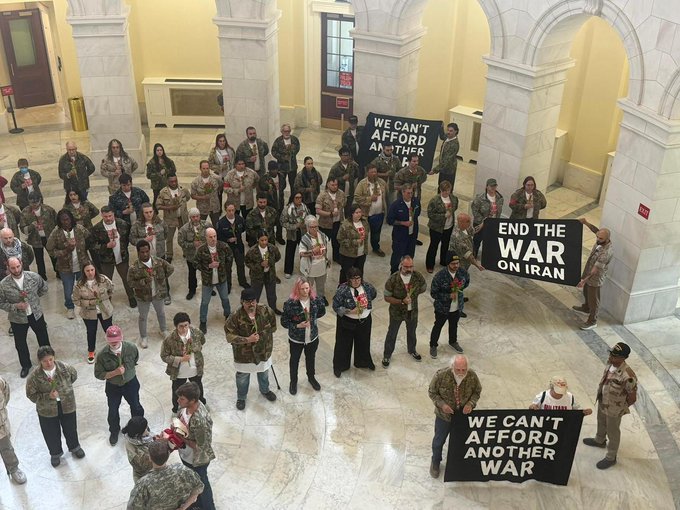Un grupo de veteranos de Estados Unidos realizó una protesta dentro del edificio Cannon, en Washington D. C., para exigir el fin de la escalada del conflicto con Irán.