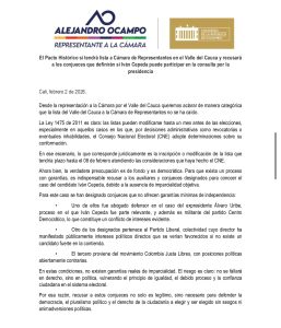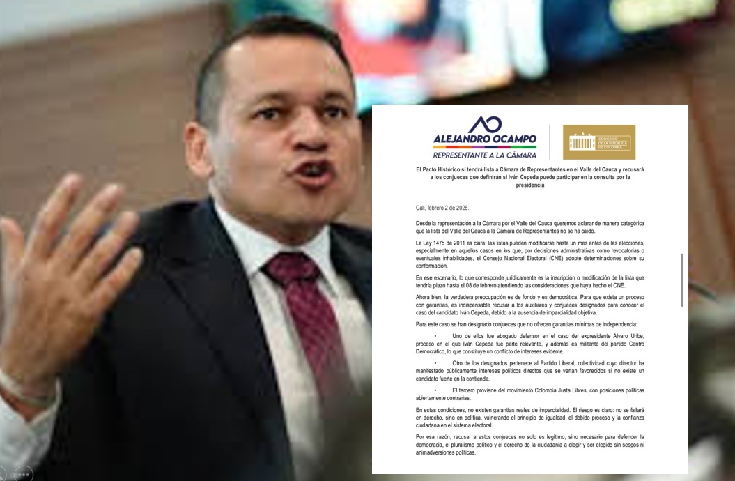 El representante también confirmó que el Pacto Histórico mantendrá su lista a la Cámara por el Valle del Cauca, recordando que la ley permite modificar candidaturas hasta el 8 de febrero y que, hasta el momento, la lista “no se ha caído”. Ocampo enfatizó que actuarán “con firmeza y por las vías legales” para garantizar la representación política del partido.