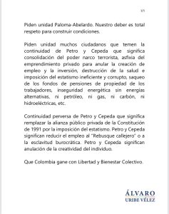 Uribe, a través de su cuenta oficial en X @AlvaroUribeVel, hizo comentarios sobre la conveniencia y los riesgos de esta alianza, sumándose al debate político en torno a la estrategia del Centro Democrático y aliados de cara a las elecciones presidenciales.