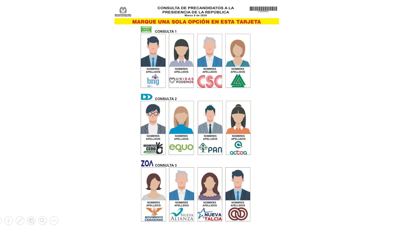 La Registraduría Nacional dio a conocer el formato oficial de la tarjeta electoral que se utilizará en las consultas presidenciales del próximo 8 de marzo, en las que los ciudadanos elegirán a los candidatos que representarán a sus respectivos bloques políticos en la carrera hacia la Casa de Nariño.