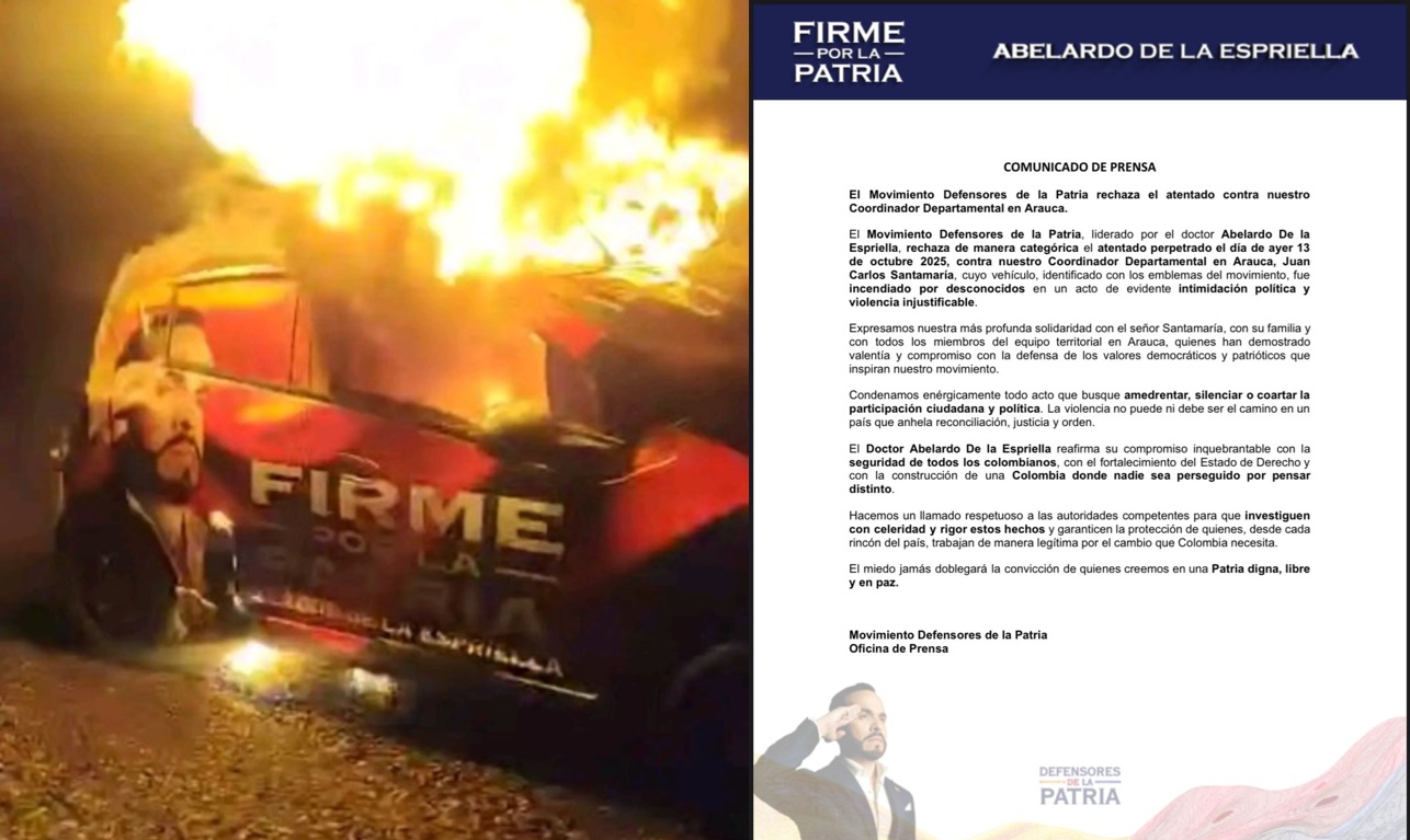 El movimiento político Defensores de la Patria, liderado por Abelardo De La Espriella, rechazó de manera contundente el ataque sufrido por su coordinador departamental en Arauca, cuyo vehículo, identificado con los emblemas del partido, fue incendiado en un acto que califican como intimidación política.