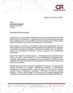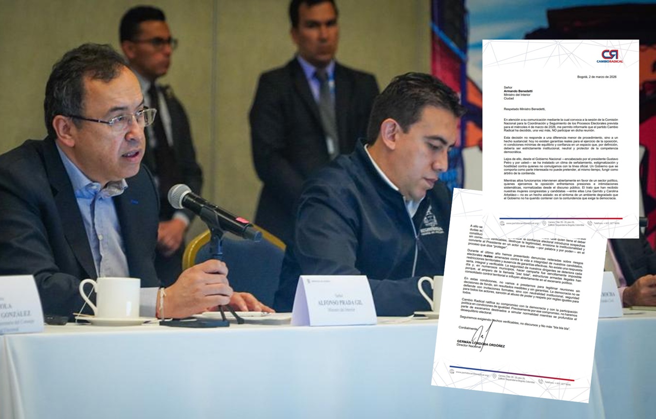El director del partido Cambio Radical, Germán Córdoba, anunció mediante una carta enviada al ministro del Interior, Armando Benedetti, que la colectividad no participará en la Comisión de Seguimiento Electoral convocada para este miércoles 4 de marzo.
