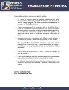 En un comunicado difundido en su cuenta de X, el partido aseguró que ha tomado “todas las medidas necesarias para evitar manipulación o infiltración por parte de terceros que, de mala fe, podrían intentar contactar a las firmas encuestadoras para afectar los procesos del Centro Democrático”.