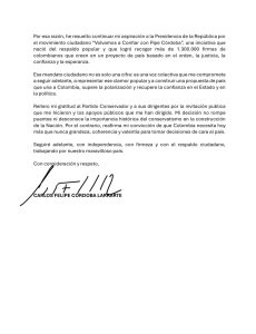 Córdoba confirmó que continuará su candidatura a través de su movimiento independiente, el cual logró recolectar cerca de 1’300.000 firmas como respaldo ciudadano.