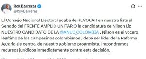 El precandidato presidencial Roy Barreras confirmó que el Consejo Nacional Electoral (CNE) revocó a Nilson Liz de la lista al Senado por el Frente Amplio Unitario.