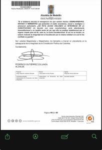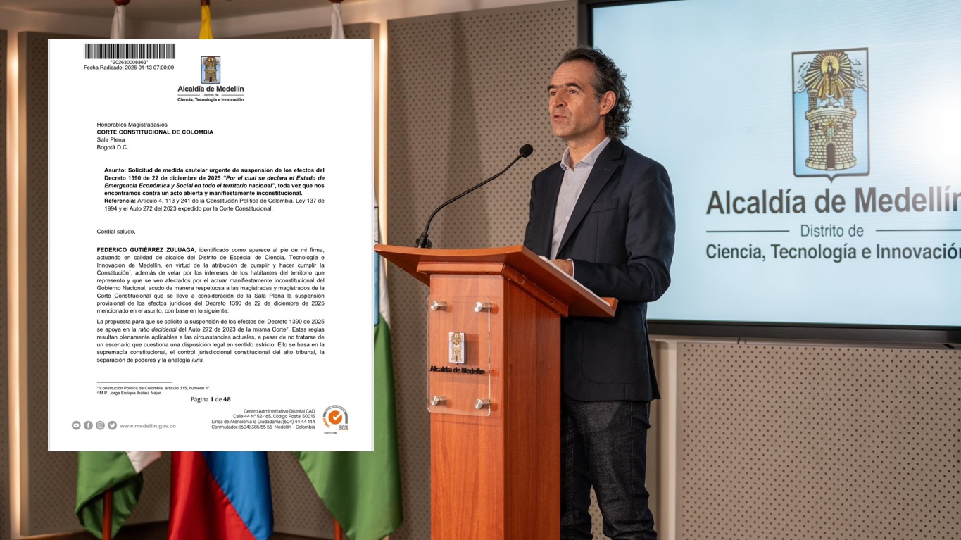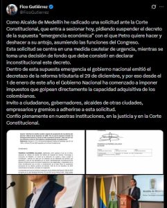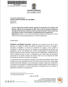 El excandidato presidencial y actual alcalde de Medellín, Federico Gutiérrez, anunció este martes que presentó una solicitud ante la Corte Constitucional para que se suspenda el decreto que declara una supuesta “emergencia económica” por parte del gobierno del presidente Gustavo Petro.