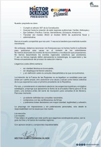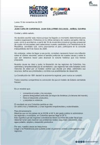 El precandidato presidencial Héctor Olimpo Espinosa (@hectolimpo) propuso a sus compañeros del movimiento Fuerza de las Regiones —Juan Guillermo Zuluaga, Aníbal Gaviria y Juan Carlos Cárdenas— aplazar hasta el 30 de enero de 2026 la realización de la encuesta interna con la que se definirá el candidato único a la Presidencia.